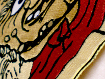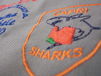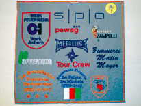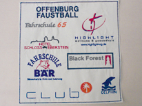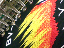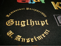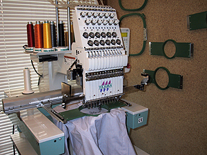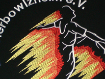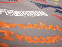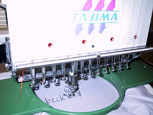 Die Produktion erfolgt dann auf eine modernen Stickmaschiene, die Designs in bis zu 11 Farben vollautomatisch herstellen kann. Bei einem Wechsel von Farbe zu Farbe werden die Fäden automatisch abgeschnitten und vernäht. Evtl. auftretende Fehler, z.B. Fadenbrüche der Ober- oder Unterfadens werden von der Maschine erkannt und sofort behoben .